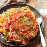 Breaded fried eggplant topped with marinara sauce, mozzarella cheese.